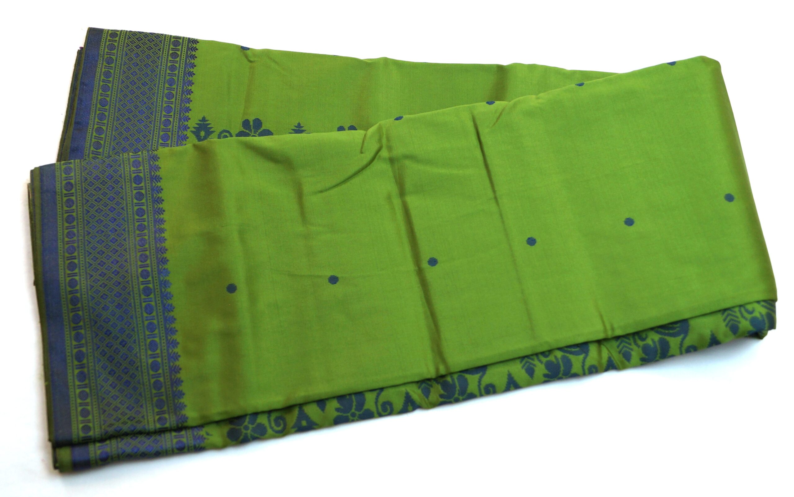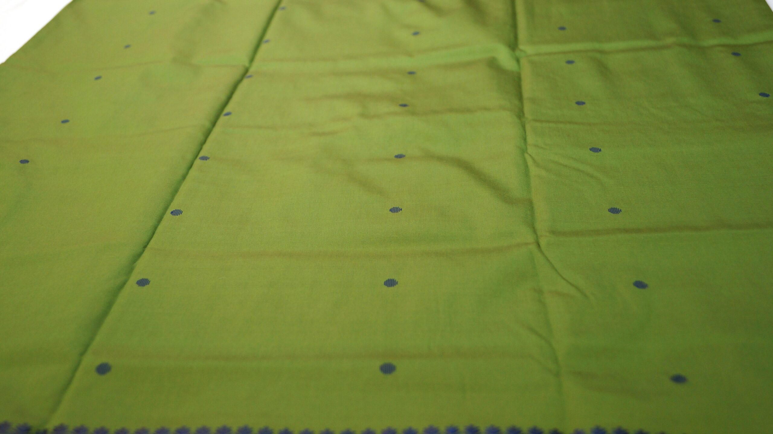 This is a pure silk saree in Green color. Small buttas throughout the saree elevates the looks of the person wearing it. Saree Pallu has a wild floral knit pattern in Blue color. Which can be worn officially or on any occasion. Saree Border has a checkered pattern with knitting in Blue Color. It Looks very beautiful and attractive because of the saree border and Pallu. Blouse is also provided as a running piece.