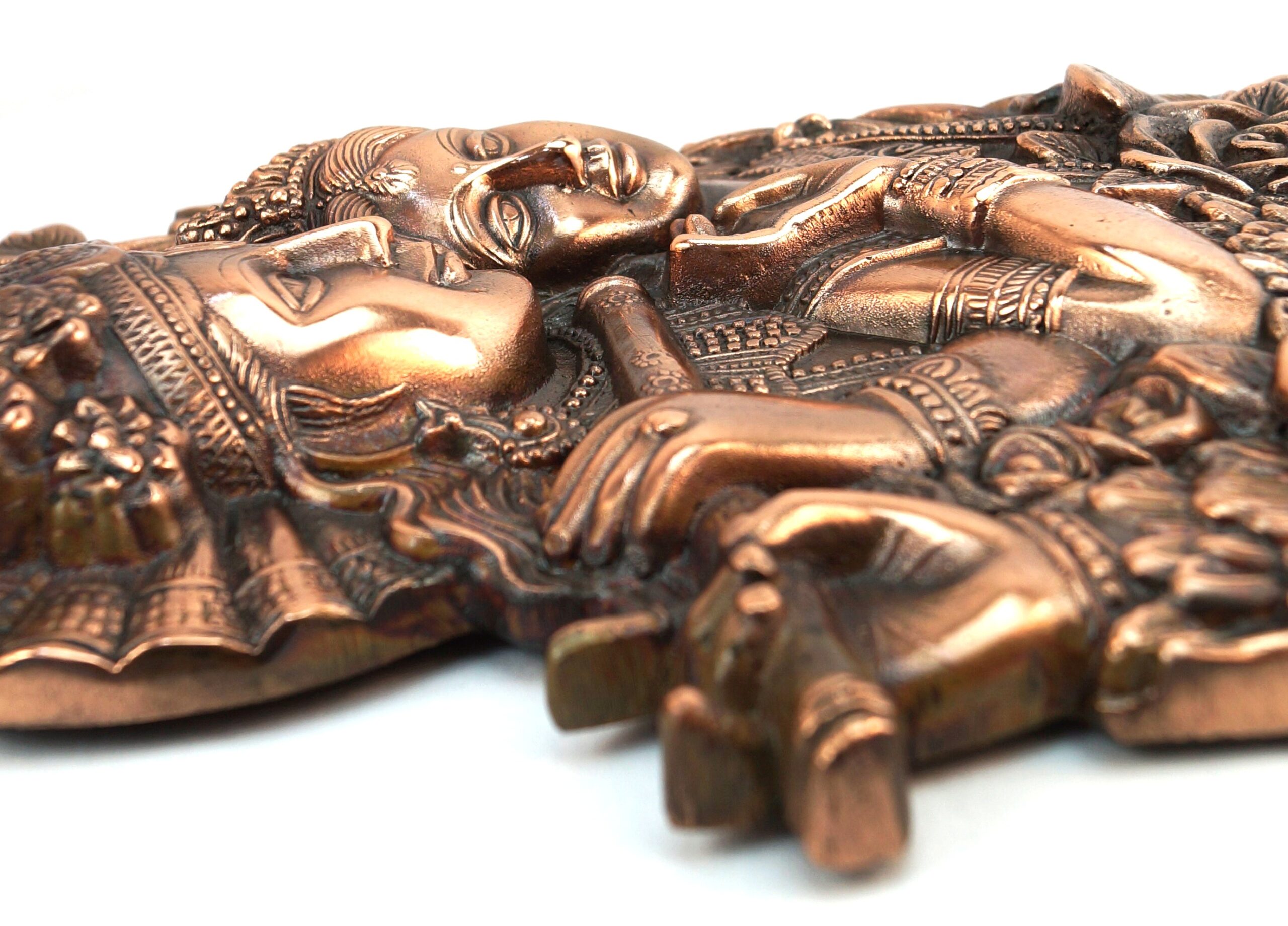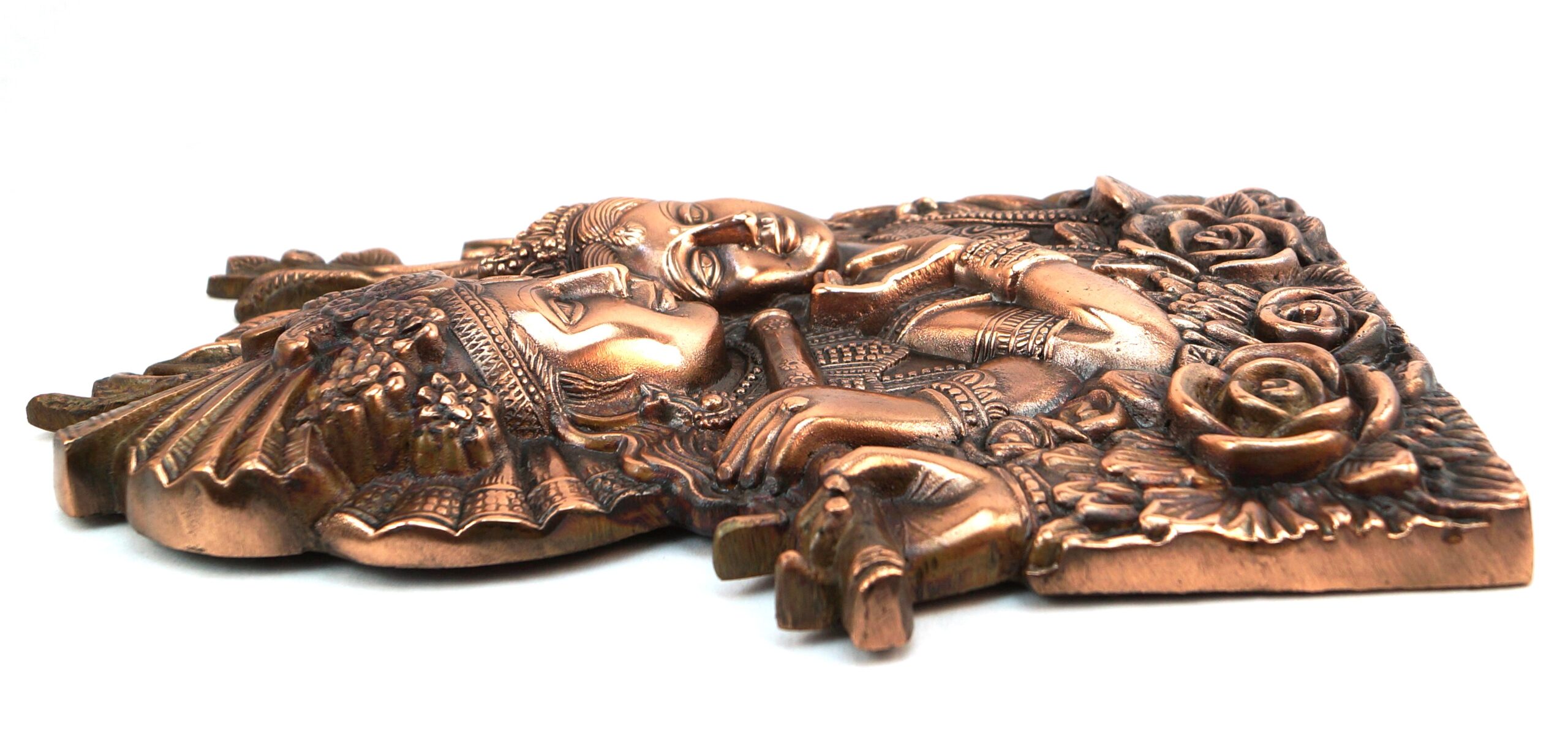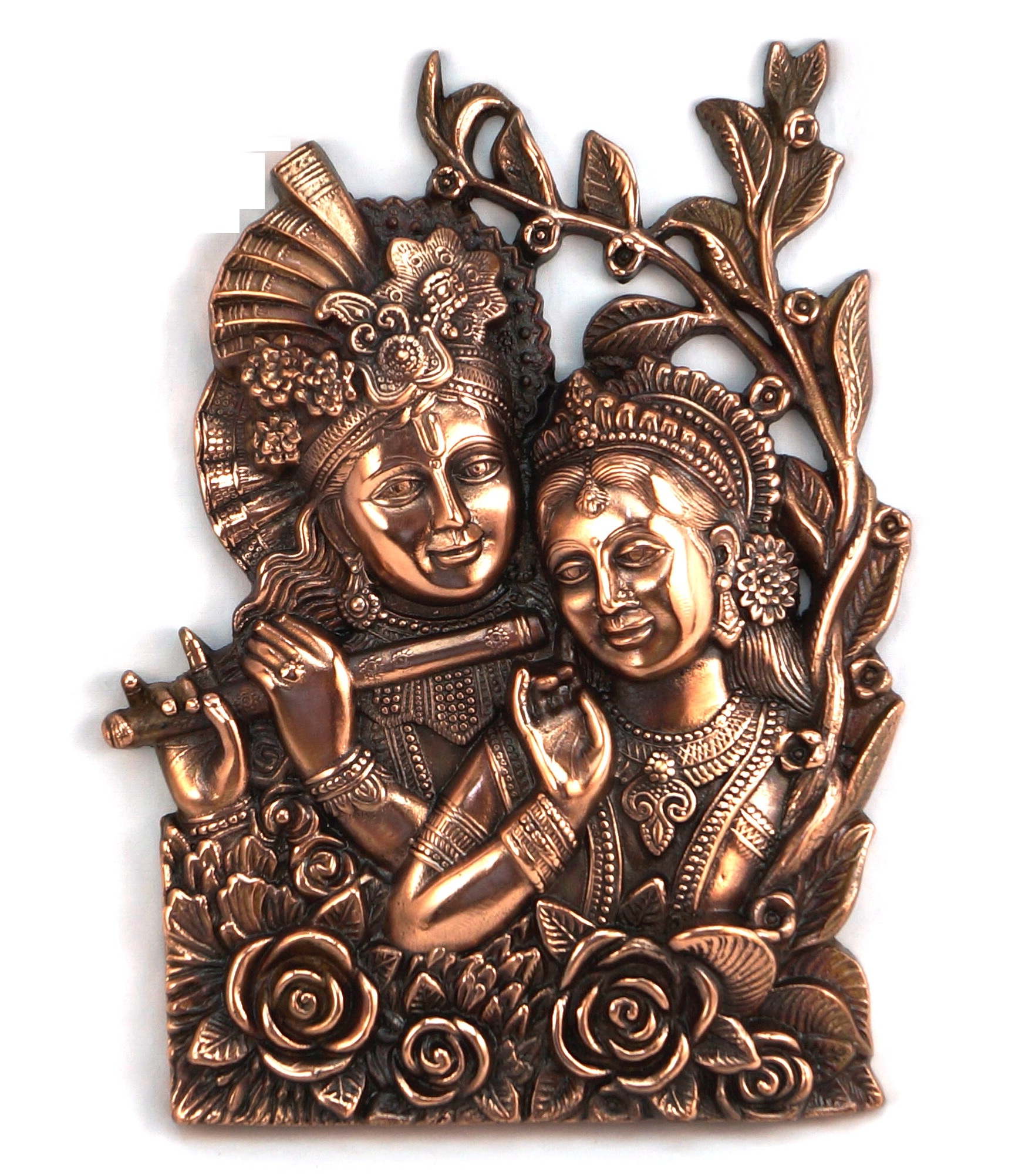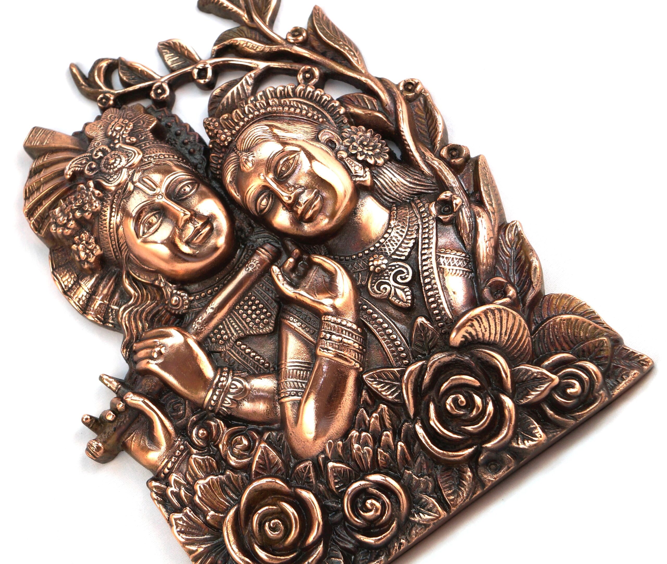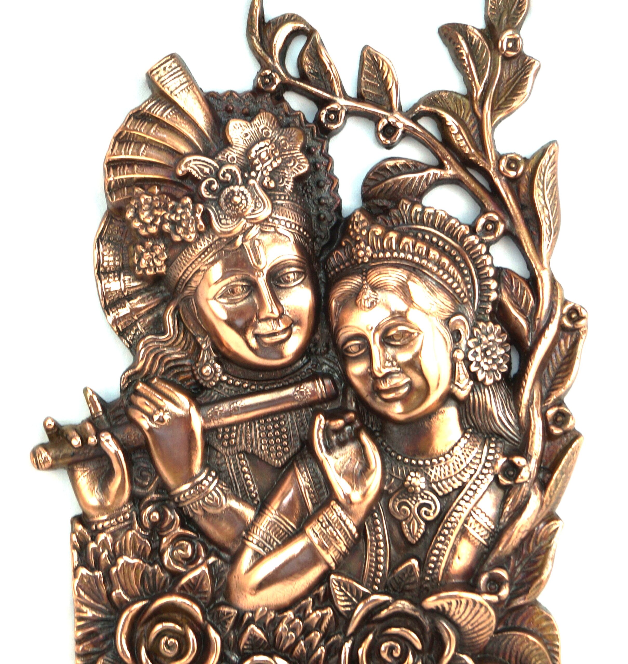 Deccani Handicrafts brings to you a Beautiful Radha Krishna wall hanging decorative artwork. This is a copper oxidized aluminum decorative metal craft. The process of making this craft involves melting aluminum and die casting, hand finishing the craft and then copper oxidization. This metal craft is designed to last for a lifetime, as time passes by, the copper color becomes darker by weathering and climatic conditions and the craft looks like an antique piece.
