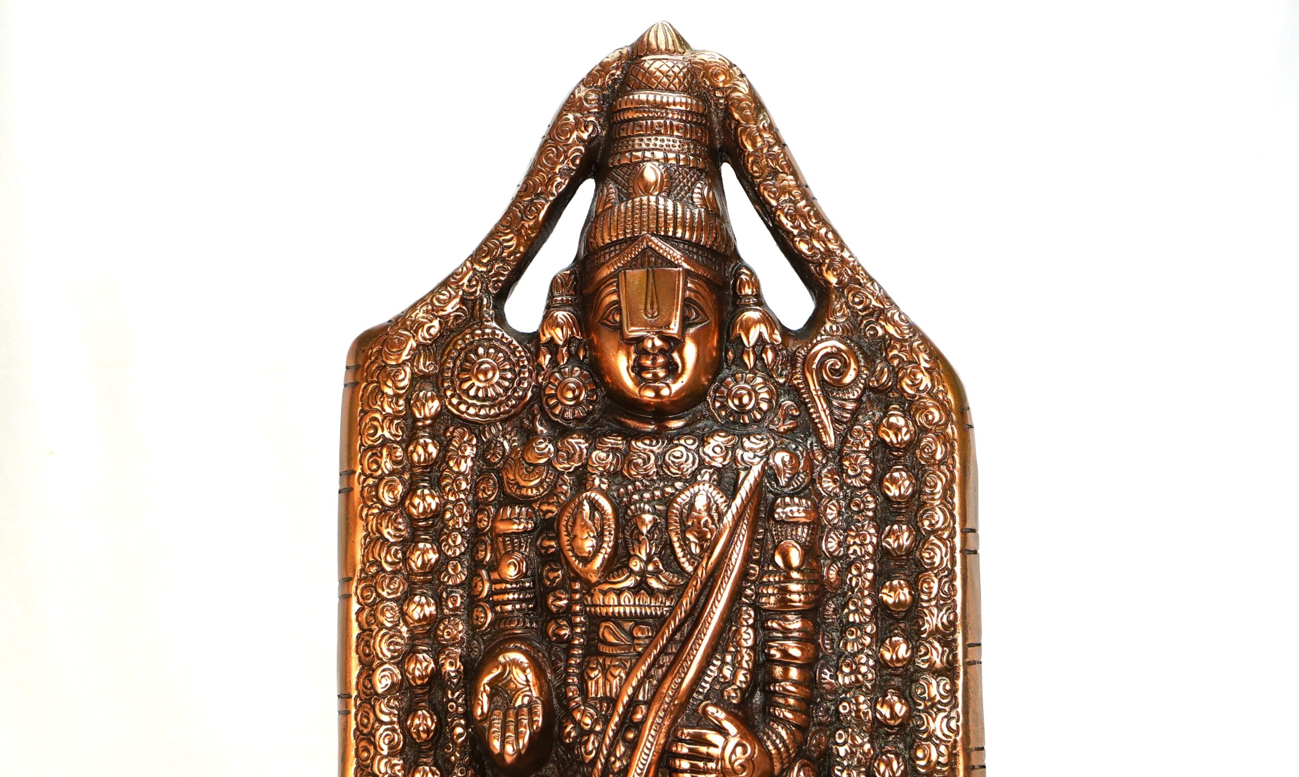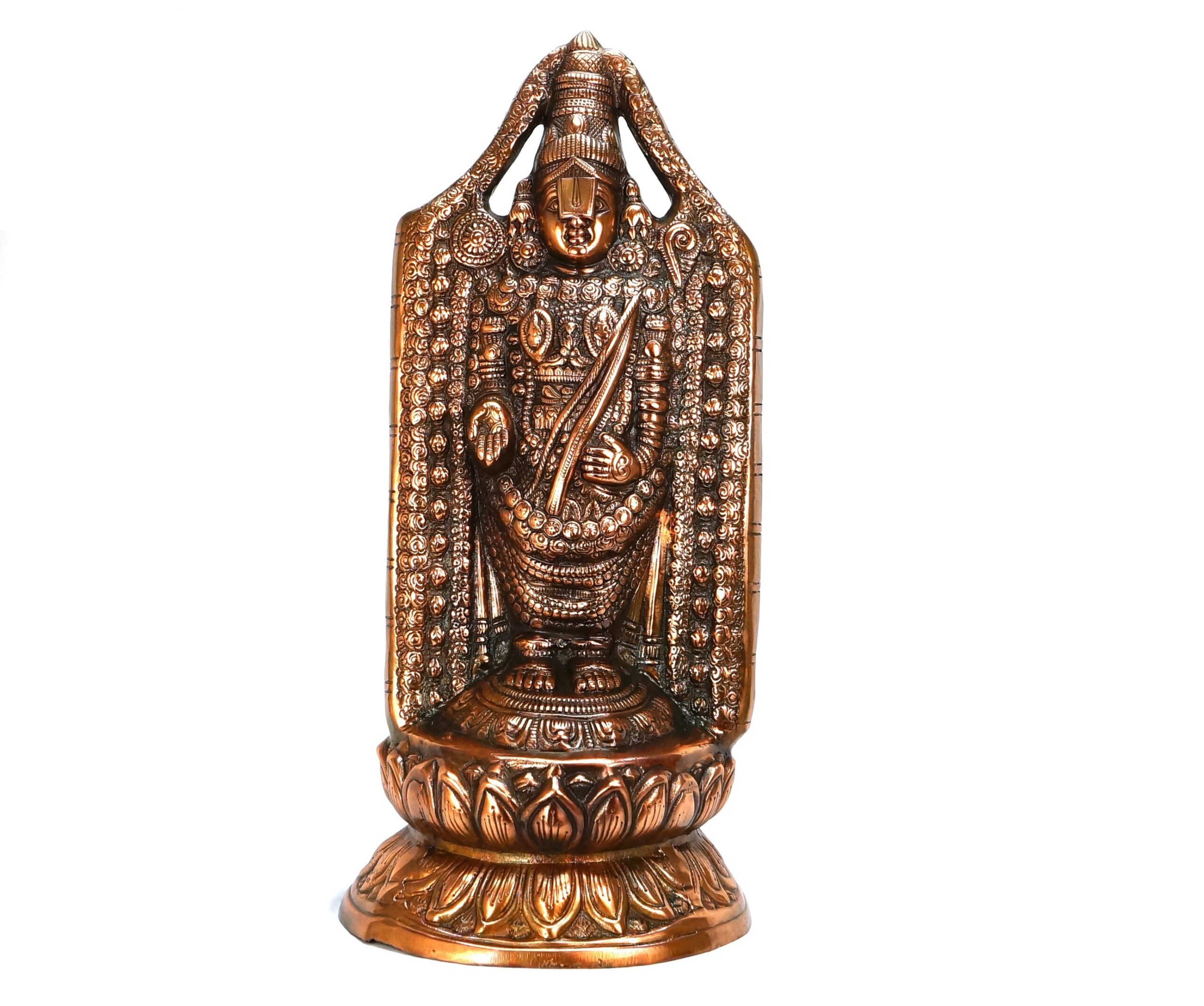 This Idol is handcrafted intricately by using various box casting techniques by our craftsmen. The idol has been recreated in likeness of Tirupati Temple Balaji but without the outside frame. We have made this style and form to give it a unique look and bring out Lord Balaji’s features and details to a much more clarity. By looking at it it is very clear that this I dol will make you mesmerized by its intriguing style and detailing. We have hand casted this in aluminum and them copper dipped. Worked on the detailing to perfection to make it remains as it is for lifetime. Lord Balaji is considered as the ‘Kaliyug Avatar’ of Lord Vishnu of the Hindu trinity Gods. The scriptures state that Venkateswara is the saviour of all suffering people in the Kali Yuga. Lord Balaji Depicted with a tilakam/Namam on his Forehead. He has ‘chakra’ on the right upper hand and conch on the left upper hand. The left hand showcased in reversing pose and right hand is depicted in bestowing pose. His two wives are resting on either side of his chest. People associate Lord Balaji with their lives and our Idol is an effort to make Tirupathi Balaji in this standing form without the frame bring out more details of the lord himself, so that you can have it at home and get mesmerized at its beauty. A must have for your pooja room if you are looking at a small statue of Balaji to complete your collection. It is also a great gifting option for your loved ones, family and friends.