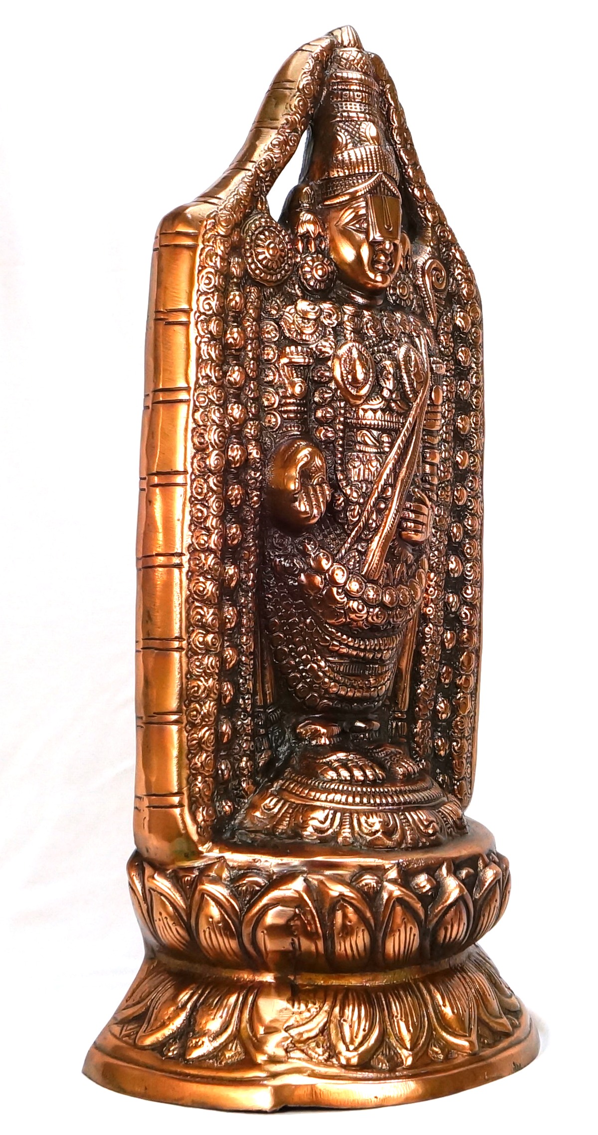 Deccani Handicrafts brings to you a Fabulous Lord Balaji Standing form Big Statue. This is a copper oxidized aluminum decorative metal craft. The process of making this craft involves melting aluminum and die casting, hand finishing the craft and then copper oxidization. This metal craft is designed to last for a lifetime, as time passes by, the copper color becomes darker by weathering and climatic conditions and the craft looks like an antique piece.